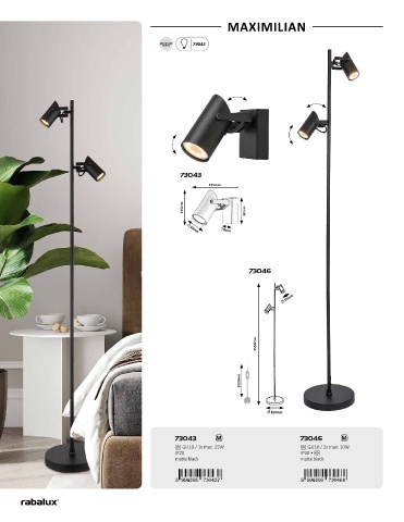 MAXIMILIAN MOVEABLE 79045 HEADS 73043 155mm 125mm 90mm 70mm 55mm 73046 55mm 1550mm 2000mm 280mm 73043 M 73046 M I GU10 / 1x max. 25W I GU10 / 2x max. 10W IP20 IP20 • X matte black matte black