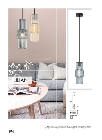 Φωτιστικά με γυαλί σε φυμέ, μελί ή μπλε χρώμα. Ανάρτηση σε μαύρο. Φωτιστικά με γυαλί σε φυμέ ή λευκό χρώμα. Ανάρτηση μαύρη με χρώμιο ή μπρονζέ.