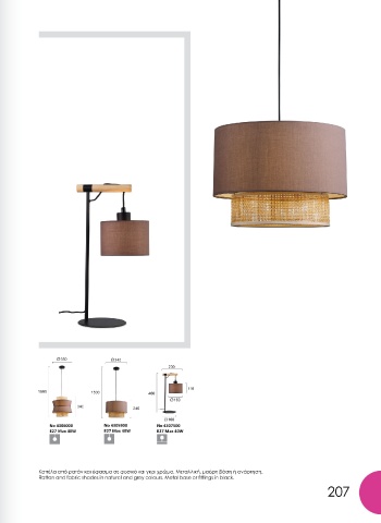 Rattan and fabric shades in natural and grey colours. Metal base or fittings in black.