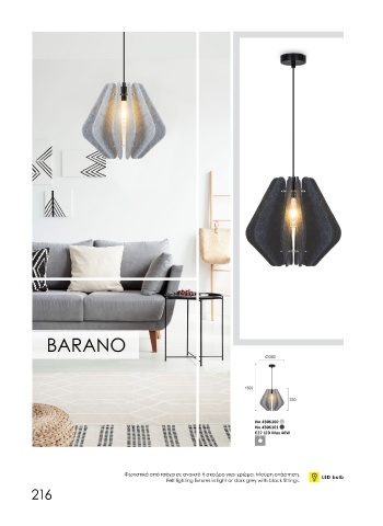 Φωτιστικά από τσόχα σε ανοικτό ή σκούρο γκρι χρώμα. Μαύρη ανάρτηση. LED bulb Φωτιστικά από ρατάν σε φυσικό ή μαύρο χρώμα και καπέλο από γκρι ύφασμα. Μαύρη ανάρτηση.