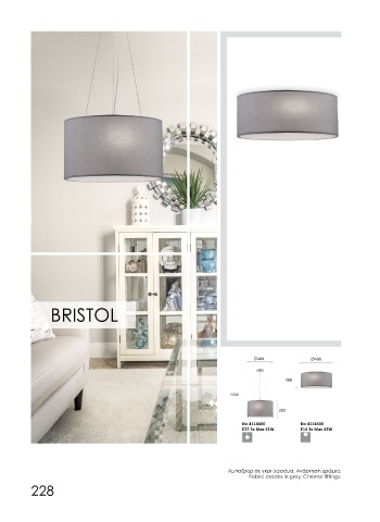 Fabric shades in gray. Chrome fittings. Lighting fixtures with straw shades, metal and PC in natural and white colour.