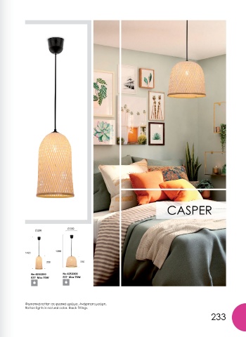 Wooden basket in natural color. White fittings. Rattan lights in natural color. Black fittings.