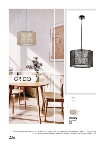 Φωτιστικά με λευκό πλαστικοποιημένο καπέλο που περιβάλλεται από φυσικό ή μαύρο μπαμπού. Ανάρτηση λευκή ή μαύρη. Φωτιστικά σε μαύρο ή φυσικό χρώμα κορδόνι.