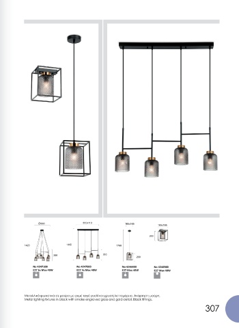 Metal lighting fixtures in black with smoke engraved glass and gold detail. Black fittings.
