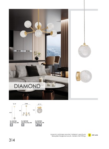 Transparent engraved acrylic. Golden matt fittings. White opal glass. Golden matt fittings.