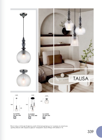 Clear or smoke glass. Black fittings with details in tin. Lighting fixtures with engraved glass in transparent. Black fittings with details in tin.