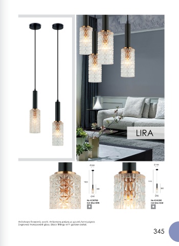 Lighting fixtures with golden glass. Black fittings. Engraved transparent glass. Black fittings with golden detail.