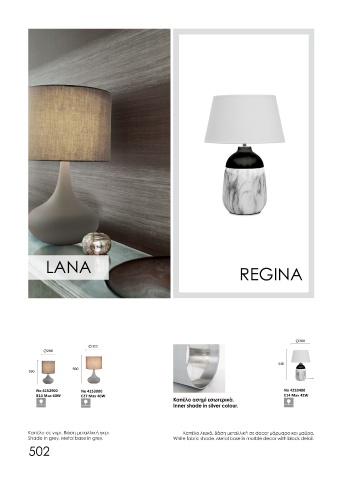 Shade in grey. Metal base in grey. White fabric shade. Metal base in marble decor with black detail. Shade in grey. Ceramic base in grey