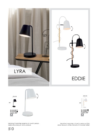 Metal office lamps in white or black. Metal fixtures in white or black with wooden detail. Metal lighting fixtures in white or black.