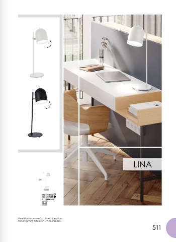Metal office lamps in white or black. Metal fixtures in white or black with wooden detail. Metal lighting fixtures in white or black.