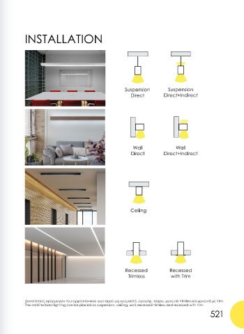The architectural lighting can be placed as suspension, ceiling, wall, recessed trimless and recessed with trim.